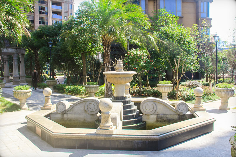 由主入口、中心下沉景觀、歐式景觀亭、特色中心水景、特色廊架、縱向貫穿整個園區(qū)。